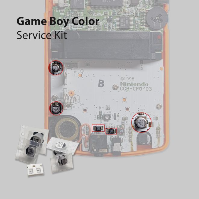 Ogni Game Boy Color dovrebbe essere sottoposto a manutenzione come punto di partenza per ulteriori interventi: I condensatori sono parti soggette a usura e devono quindi essere sostituiti con ogni retroconsole per evitare problemi. Questo kit di ricarica contiene tutti i condensatori necessari per il Game Boy Color.